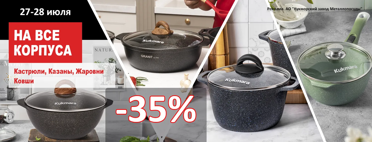 Спешим порадовать вас последней акцией уходящего месяца, а именно предоставить скидку 30% на кастрюли и ковши из нержавеющей стали и 35% на всю остальную корпусную посуду Kukmara!