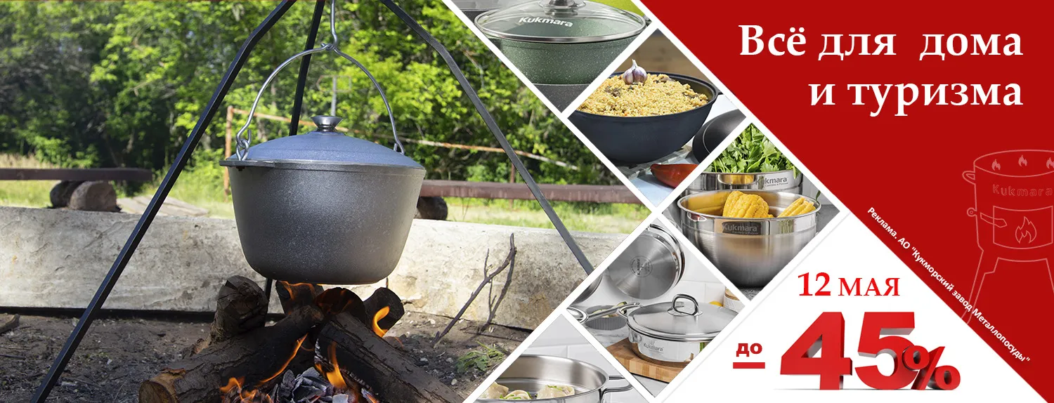 -40% на всю литую алюминиевую посуду, посуду с антипригарным покрытием, чугунную посуду, чайники, кухонные принадлежности, товары для туризма и отдыха;
